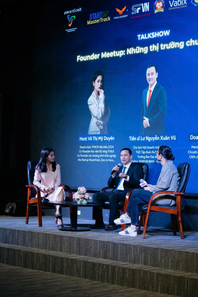 Đồng thời, Talkshow còn được dẫn dắt bởi Host Võ Thị Mỹ Duyên – Doanh nhân TPHCM tiêu biểu 2024, đồng thời là nhà đồng sáng lập của nhiều thương hiệu và là gương mặt quen thuộc thường xuyên đồng hành cùng cộng đồng khởi nghiệp Việt Nam. Host Mỹ Duyên đã khéo léo dẫn dắt talkshow cực kỳ hấp dẫn, gay cấn với màn tranh luận của hai chuyên gia – một người xuất thân từ khối ngành kỹ thuật (Đại học Bách Khoa, ĐHQG TP.HCM) – một người xuất thân từ khối ngành xã hội (Đại học Khoa học Xã hội và Nhân Văn, ĐHQG TP.HCM – với những suy nghĩ và quan điểm rất trái ngược nhau trong triết lý kinh doanh, tinh thần khởi nghiệp, nhưng đều có những thành tựu vượt bậc trên thương trường.